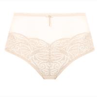 A beautiful tulle insert, cut in a pointed shape, sculpts and lightens the front of the ultra-comfortable Verity panty. Delicate lace defines the waist front and back, and a satin bow adds an elegant finishing touch. A panty that offers fuller coverage with a high waist and low leg.