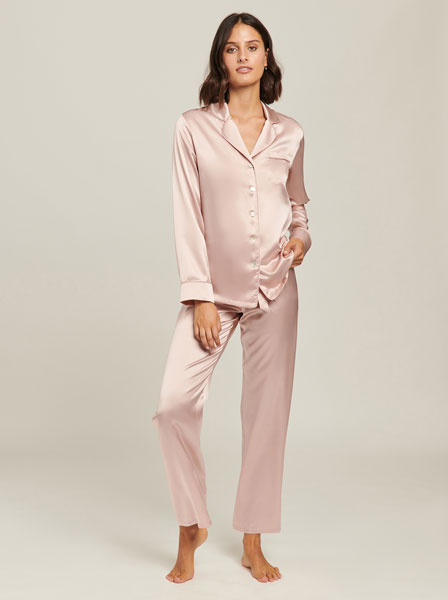 Silk Pyjama in Silver Pink. Minimal in nature, the Ginia signature range comprises coveted wardrobe classics. Cut from lusciously soft silk to create a fluid and flattering silhouette.
