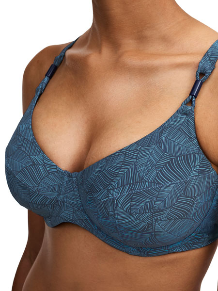 Tidra leaves bikini top offers good coverage and support. The non-padded underwired cups give a rounded shape and lift. The underwire sits on a base piqué wire channel and has strong lining inside the cups, a central gore, boned side band and the addition of a yoke inside the cup for a greater support and cantered breast. The height of the centre gore varies based on size.