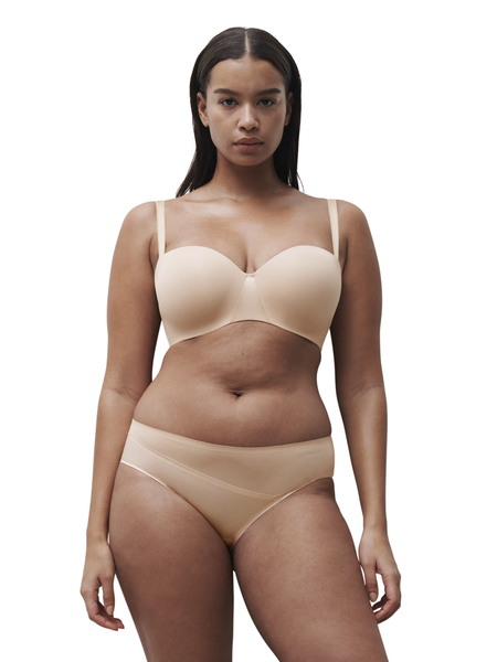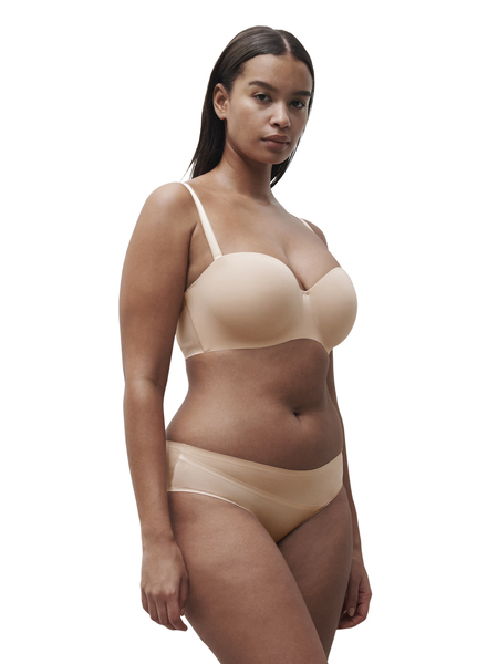 With its removable straps, this bandeau bra is ideal for all types of outfits. The plain, moulded cups give a natural rounded shape. The silicone strip on the back gives support around the band, ensuring it stays in place throughout the day. The seamless finish and smooth materials offer a comfortable second-skin feeling. Fully invisible under all outfits. The matte/shiny contrast gives a modern touch.