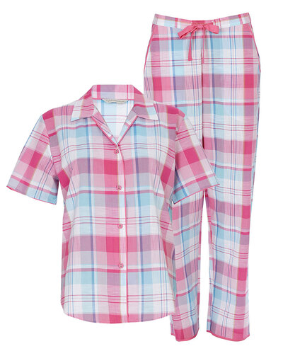 Elevate your loungewear collection with the Pink Mix Check Short Sleeve Pyjama Set. Immerse yourself in the luxurious comfort of 100% cotton, keeping you cosy every evening. The classic pink mix check will be your new favourite. The pyjama top boasts a revere collar, pink modal-covered buttons, and a shaped bottom hem. Paired with the pyjama bottoms, featuring pink modal trim and a tailored fit, this set is perfect for summer nights, promising unmatched comfort and style for those who appreciate the finer things.