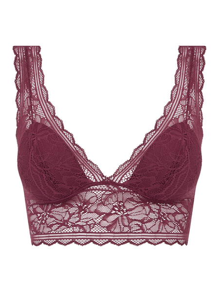 This wirefree bra has soft stretch lace for a comfortable fit. The sewn in foam pads on the cups give shaping across the bust. The triangle shape neckline and long line band are right on trend.