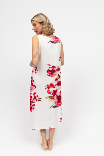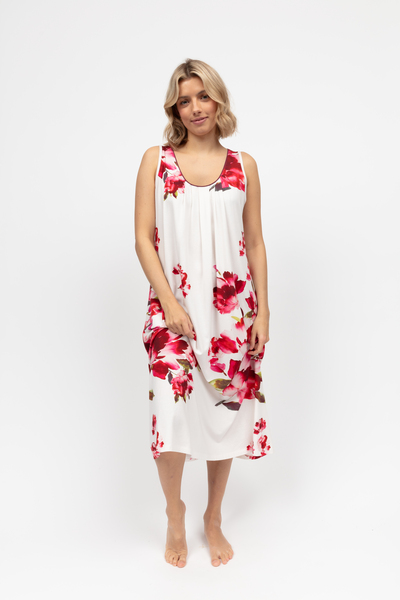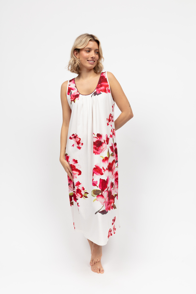 Delicate details for sleepwear that's equally delicate on the skin? With the dewy glow of red blooms against a white canvas, the Isabella Oxblood Mix Floral Printed Jersey Long Nightdress invites you to take things slower, whether it's the first hours of the morning or the last hours of the evening. Cut from a jersey blend, this nightdress is both perfect for those big stretches in bed and for the hurried, excitable energy that an early morning with no plans encourages. Trimmed with a deep oxblood modal piping along the rounded scoop neckline, the wide shoulder straps, and generous pleats of the nightdress open it up into a dramatic flowing piece that lets the vibrant colours of the floral print shine.
