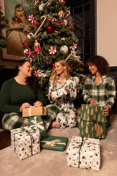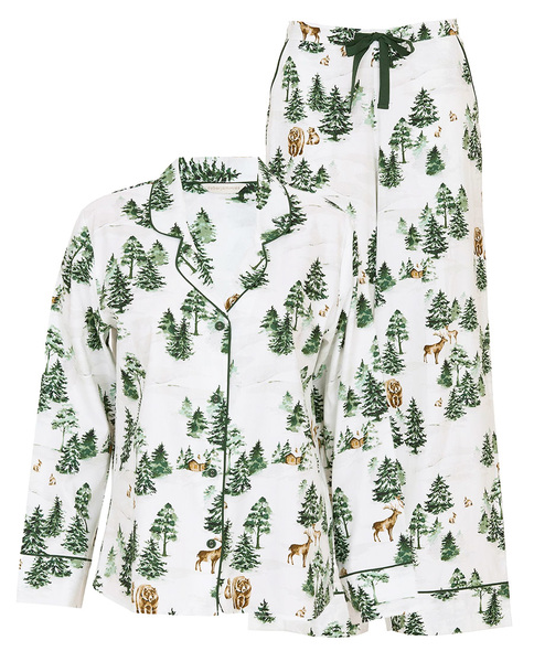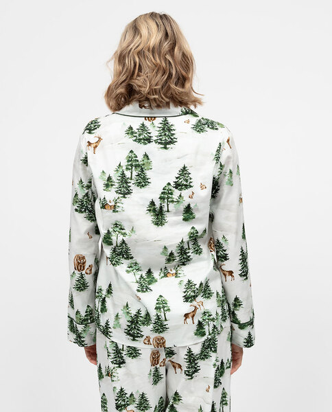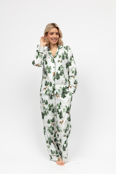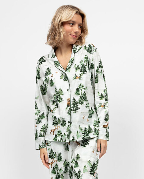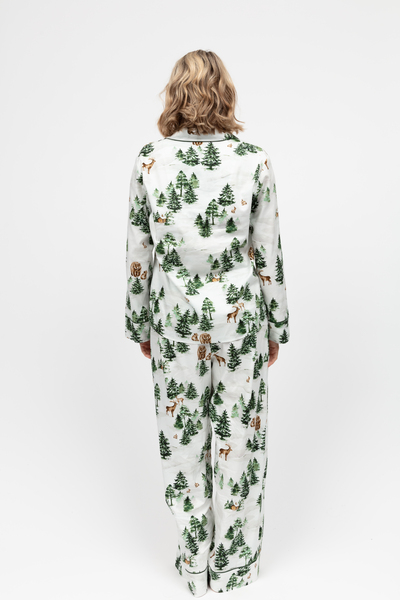 The Fern Alpine Print Long Sleeve, Wide Leg Pyjama Set is your cosy essential for seasonal lounging. Crafted in a super-soft blend of 60% cotton and 40% modal, this set feels gentle on the skin. With a serene alpine print of green pine trees, snow-dusted cabins, and woodland animals set against a clean white background, it brings the charm of a winter cabin getaway straight to your sleepwear drawer. The long-sleeved top features a revere collar, olive green functional modal-covered buttons, and matching modal piping to softly edge the opening, cuffs, and hems. The wide-leg pyjama bottoms are equally considered, trimmed in modal and designed with a flat front, elasticated back waistband, and adjustable drawstring for a personalised fit. Two side pockets and straight cuffed hems add functionality and flow, perfect for slow starts and long, lounging afternoons. Whether it’s for festive mornings, windowside evenings, or simply enjoying a weekend with no plans, this coordinated set delivers style, softness, and all the cosy feels the season calls for.