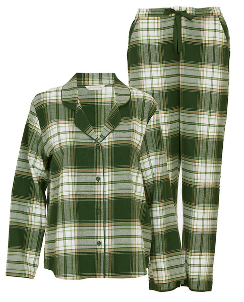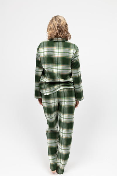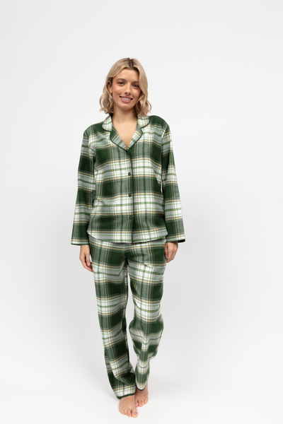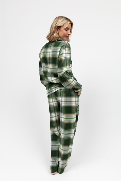 Unwinding in the familiar, classic pattern of the Fern Brushed Check Long Sleeve Pyjama Set. With a pattern that speaks of slower days and worn-in comforts in soft olive greens and gentle neutrals. Made with 100% cotton that’s been lightly brushed to energise the fibres. The long sleeve top borrows from traditional blouses with a revere collar, a shaped hem, and functional modal-covered buttons that make even the most effortless lounging feel considered. The trousers? Cut with a clean silhouette, gently tailored with a flat front and adjustable drawstring, and finished with an elasticated back waistband so that they can be worn as tightly or loosely as you please.