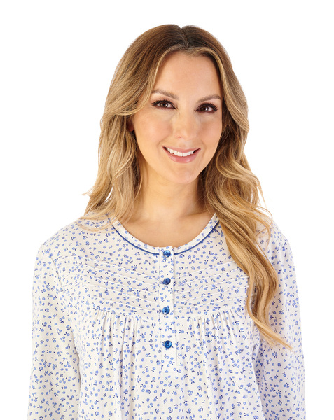 This nightdress features a delicate ditsy print on soft, breathable 100% cotton jersey fabric, ensuring comfort throughout the night. With a 45" length and long sleeves, it offers ample coverage and warmth. The round neck is enhanced by pintuck detailing on the V-yoke and a classic 4-button placket, combining subtle elegance with practical design.