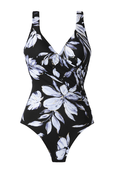 Wrapped to perfection. This sculpting one piece swimsuit defines your waist and flatters every curve with a timeless wrap silhouette and artful draping that conceals in all the right places.