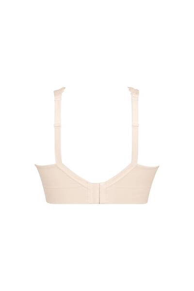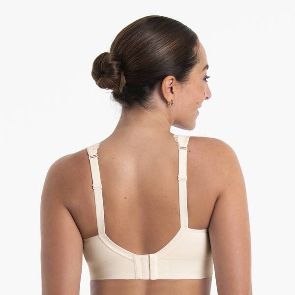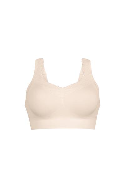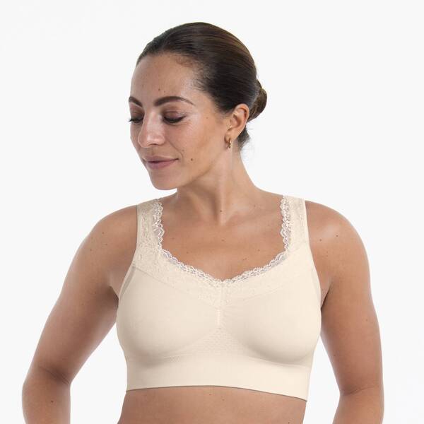 Feminine and functional: The LOTTA LACE bra features a wide floral lace band framing the neckline. Its seamless, double-layered cups with removable pads and bilateral prosthesis pockets offer soft support and all-day comfort, even after breast surgery.