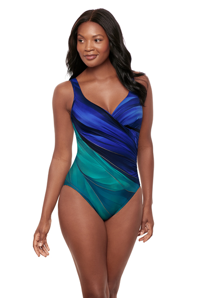 • Molded foam cups with underwire lift and shape • Surplice neckline enhances bust • Fixed padded straps for ease and support • Signature Miratex fabric smooths and sculpts • Scoop back • Moderate Leg Cut • BODY: 69% Nylon, 31% Spandex and 82% Nylon, 18% Spandex • LINING: 69% Nylon, 31% Spandex • After each use, hand wash in cool, clear water and hang to dry