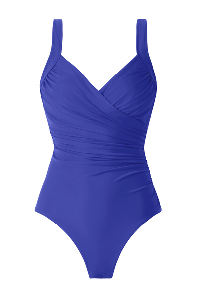 Sensibly shirred from bust to waist, the Miraclesuit Solid Sanibel Swimsuit, showcases a slimmer silhouette as supportive, thicker and adjustable shoulder straps lead to a mid-scoop back for the ultimate in coverage. A shapely v-neckline accents your bust and leads to unique torso-wrapping to please every wandering eye. Made with LYCRA® XTRA LIFE™ Spandex for a long-lasting fit.