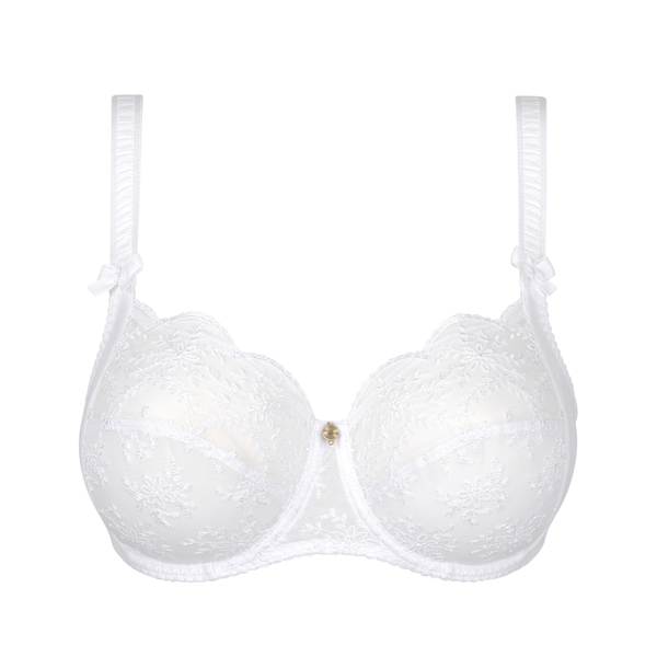 The full-cup Charlotte bra combines a refined aesthetic with faultless support. The English embroidery is modernised and lined with tulle in the lower cups, ensuring comfort and hold up to a H cup. An essential piece designed to support the fuller bust on a daily basis. The White colourway is romantic and luminous, revealing the rich pattern.