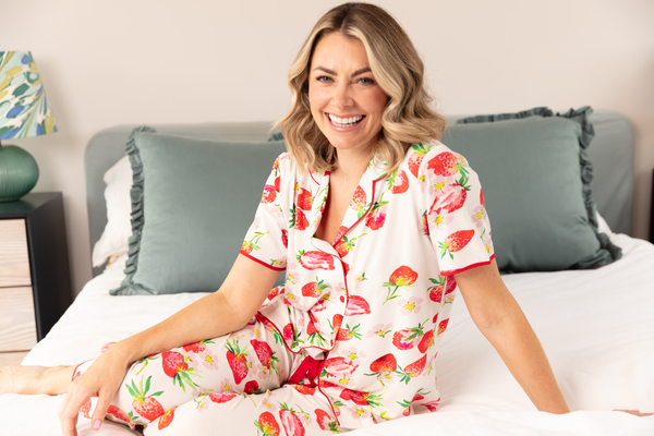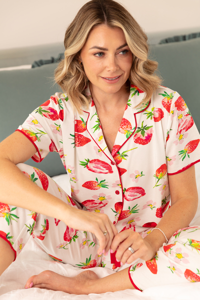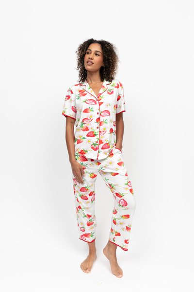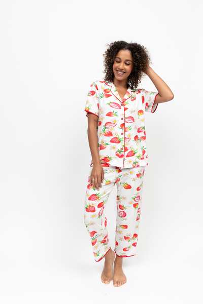 Summer’s longer days mean there’s more hours to lounge in style. Endlessly wearable and expertly crafted, the Pippa Strawberry Printed Pyjama Set brings the brightness of the warmer season into your everyday unwind. Printed with ripe red strawberries and soft pink blossoms across a crisp white base, this set captures the light, playful, and full-of-charm spirit of the spring and summer months. Cut from a beautifully soft blend of 52% cotton, 41% modal, and 7% elastane, both the top and bottoms are breathable, smooth to the touch, and gently stretchy for ease of movement and all-night comfort. The short-sleeved top is finished with red modal piping along the sleeves, collar, and hem, and a matching set of covered buttons for a refined finish. The cropped pyjama bottoms feature an elasticated back waist, an adjustable front drawstring, and straight hems that sit lightly at the ankle.