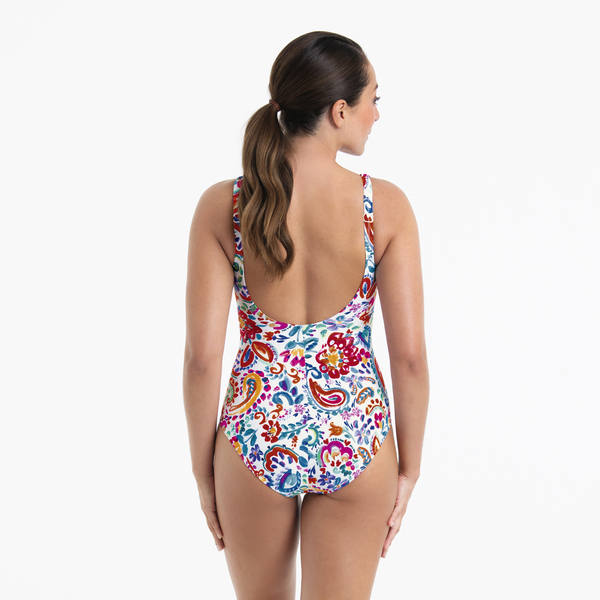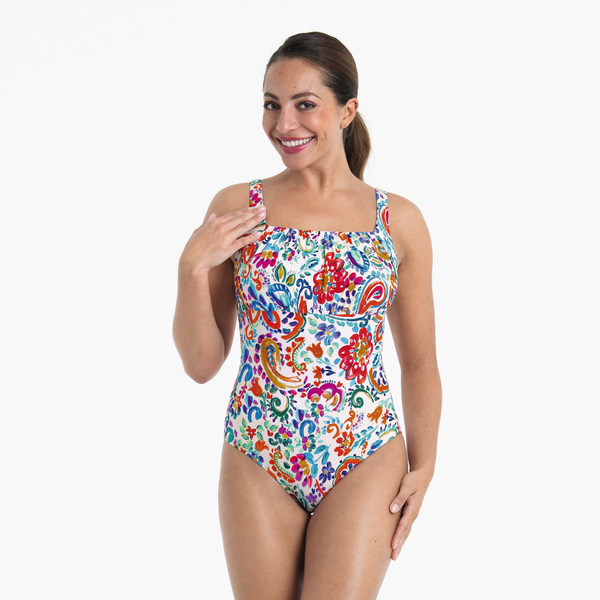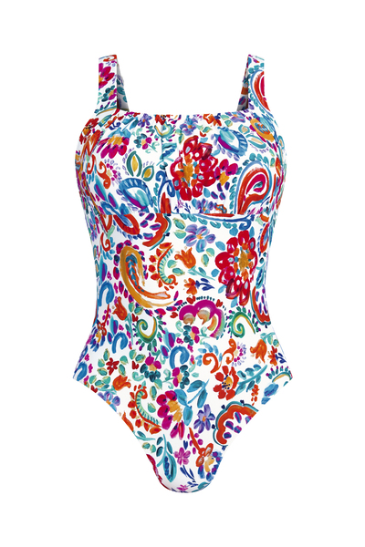 A true highlight for your summer: The CALVIÀ swimsuit impresses with youthful design and clear, functional details.The slightly elevated square neckline appears open and modern.Adjustable straps and integrated soft cups support a comfortable fit.Side shaping panels in the cup area and fine gathers at the neckline and underbust seam create a concealing effect.The visible lining on the front and back completes the thoughtful design of the model.