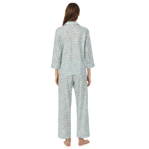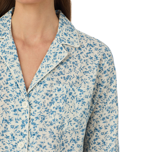 This lightweight cotton lawn pyjama set is ideal for the warmer months. A beautiful blue and white floral design mixes perfectly with a classic pyjama shape to create a style which will never go out of fashion. Every detail is considered, featuring a notch collar, breast pocket with RL embroidered logo, cuffs with piping, 3/4 length sleeve, a gathered elasticated waist with tie, and a full length trouser.